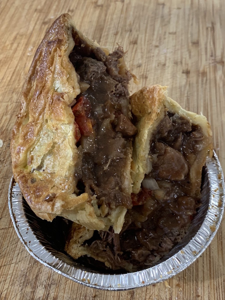 Julia Lee enjoyed a hearty Chunky Steak, Cheese and Bacon Pie, noting that it was double the normal size and bursting with flavor. The gravy was deliciously rich, complementing the tender steak perfectly, while her friend reveled in a visually arresting Chicken and Camembert Pie.